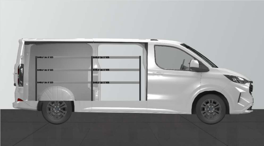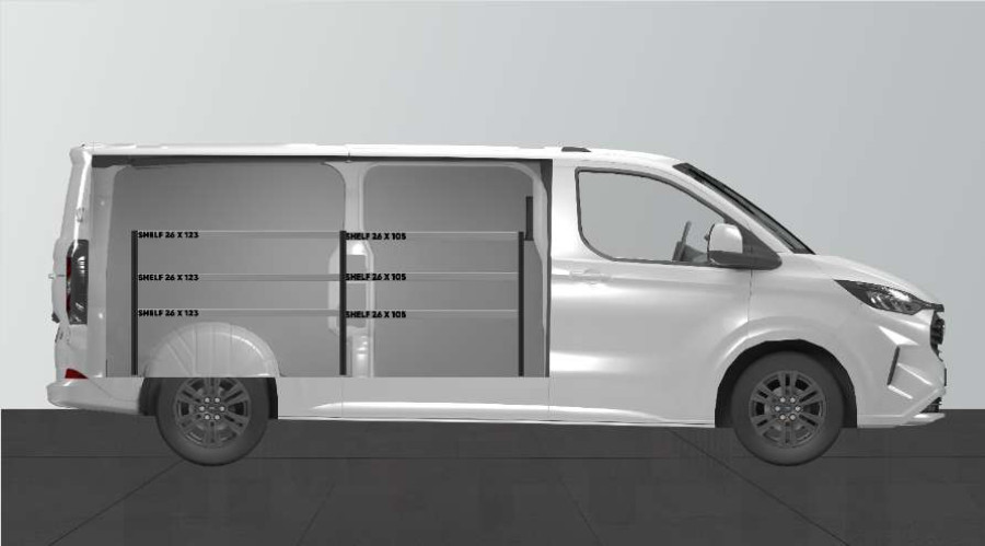 Eine Fahrzeugeinrichtung für alle, die die Breite ihres Ford Custom & VW Transporter L2 beibehalten möchten. Die Einrichtung hat eine Tiefe von nur 262,5 mm und bietet gute Aufbewahrungsmöglichkeiten für Kleinteile, z. B. Schraubenpackungen und kleinere Artikel, geeignet für Hausmeister, Elektriker und Heizungs- und Sanitärinstallateure. Es besteht die Möglichkeit, die Einrichtung durch unsere cleveren Modulboxen zu ergänzen. An den Regalwänden lässt sich durch unsere Smartboxen zusätzliche Staufläche gewinnen.