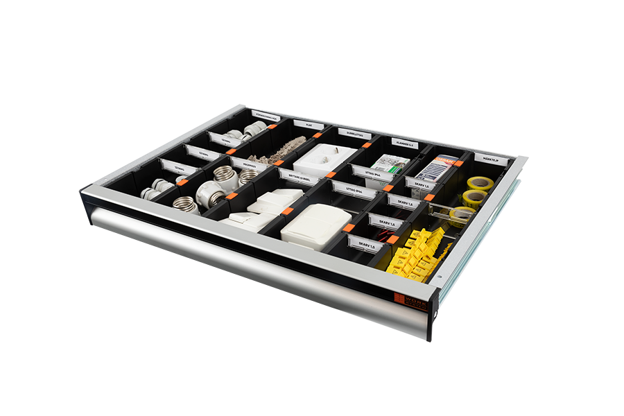 Diese Einsätze können Sie auch mit Etiketten und weiteren Trennwänden ergänzen
