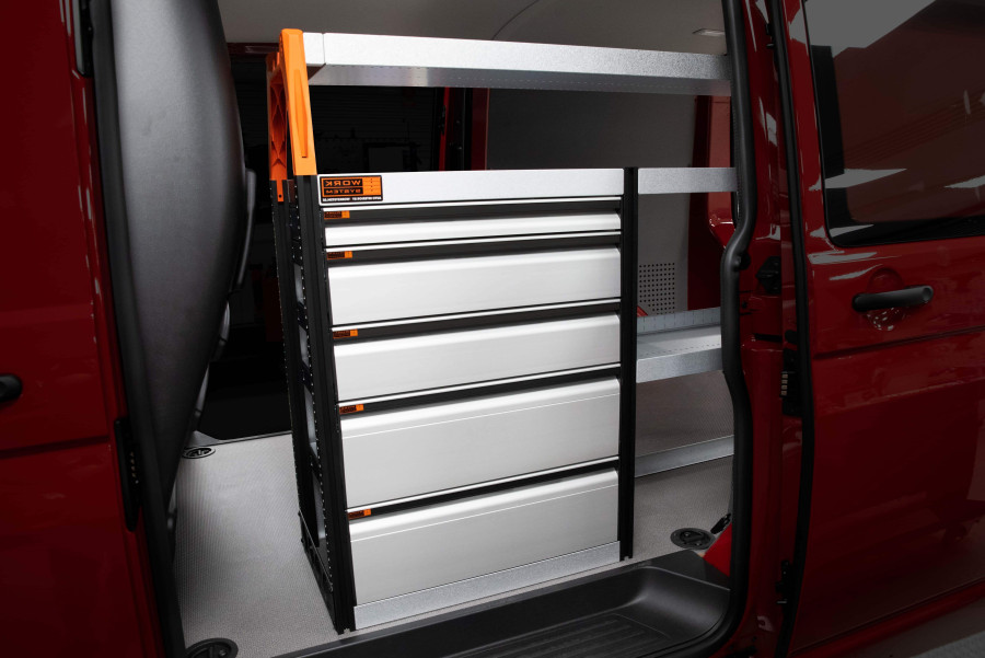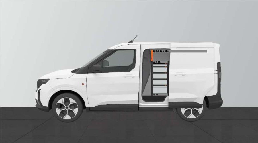 Dies ist eines der beliebtesten Systeme für den Ford Courier L1 mit Seitentür auf der Seite der Einrichtung. Die Einrichtung bietet gute Aufbewahrungsmöglichkeiten für Werkzeugtaschen/-koffer, Maschinen und Kleinteile. Sie umfasst eine Schubladeneinheit mit 5 Schubladen in verschiedenen Größen, damit jeder Ausrüstungsgegenstand seinen Platz erhält. Hinter den Schubladen befindet sich eine Werkzeugtafel, die zusätzliche Aufhängungsmöglichkeiten im Fahrzeug bietet. Die Schubladen auf Kugellagerschienen werden häufig durch unsere neuen Schubladeneinsätze und Trennwände ergänzt, um maximale Ordnung und Übersichtlichkeit zu gewährleisten. Die Regalwand wird gerne auch durch unsere Smartboxen ergänzt, um den Stauraum zu maximieren.