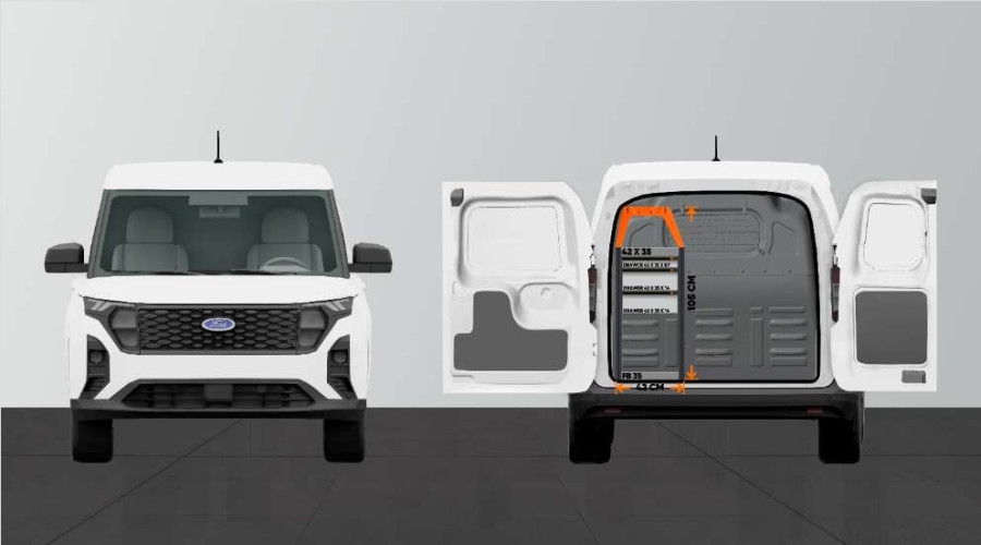 Diese Fahrzeugeinrichtung verfügt über eine leicht zugängliche Schubladeneinheit direkt hinter den Hecktüren des Ford Courier L1.