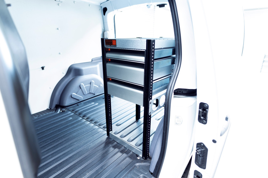 Mit der Serie Work System V-LS3 bieten wir Ihnen ein Fahrzeugregal für Berlingo, Combo, Proace City & Partner L2, bestehend aus einem Regal mit drei Schubladen, ausgestattet mit Kugellagerschienen.