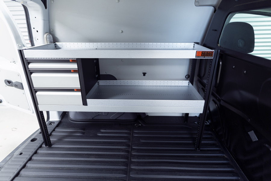Eine preisgünstige Alternative für alle, die eine Kombination aus Schubladen auf Kugellagerschienen und Regalböden für ihren Ford Courier L1 suchen. Dank einer Tiefe der Einrichtung von 420 mm lassen sich die meisten auf dem Markt erhältlichen Werkzeugtaschen/-koffer problemlos verstauen. Die Schubladen werden gerne durch unsere Schubladeneinsätze und Trennwände ergänzt, die es Ihnen erleichtern, Ordnung in Ihr Kleinteilsortiment zu bringen.