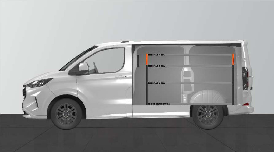 Eine Fahrzeugeinrichtung für Ihren Ford Custom & VW Transporter L1, die gute Aufbewahrungsmöglichkeiten für Werkzeugtaschen/-koffer, Maschinen und Kleinteile bietet. Die Regalböden der Einrichtung haben eine Tiefe von 420 mm, dank derer sich die meisten auf dem Markt erhältlichen Werkzeugtaschen/-koffer problemlos verstauen lassen. Das obere Regal mit 262,5 mm wird oft durch unsere Modulboxen ergänzt, um Platz für die Aufbewahrung von Kleinteilen zu schaffen. Vergessen Sie nicht, die Werkzeugtafel der Regalwand zu nutzen.