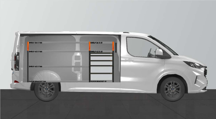 Dies ist eines der beliebtesten Systeme für den Ford Custom & VW Transporter L2. Die Einrichtung bietet gute Aufbewahrungsmöglichkeiten für Werkzeugtaschen/-koffer, Maschinen und Kleinteile. Sie umfasst eine Schubladeneinheit mit 5 Schubladen in verschiedenen Größen, damit jedes Teil der Ausrüstung seinen Platz erhält. Die Schubladen auf Kugellagerschienen werden häufig durch unsere neuen Schubladeneinsätze und Trennwände ergänzt, um maximale Ordnung und Übersichtlichkeit zu gewährleisten. Die Ergänzung der Regalwand durch unsere Smartboxen ist ebenfalls eine beliebte Alternative, um den Stauraum zu maximieren.