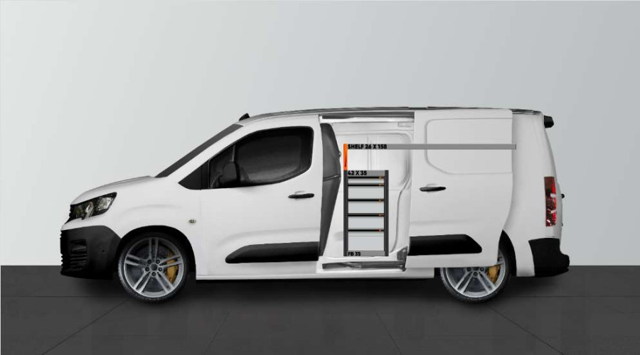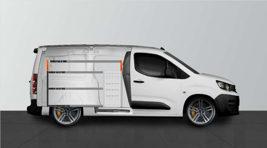 Dies ist eines der beliebtesten Systeme für den Citroën Berlingo, Opel Combo, Fiat Doblo Toyota Proace City & Peugeot Partner L2mit Seitentür auf der Seite der Einrichtung. Die Einrichtung bietet gute Aufbewahrungsmöglichkeiten für Werkzeugtaschen/-koffer, Maschinen und Kleinteile. Sie umfasst eine Schubladeneinheit mit 5 Schubladen in verschiedenen Größen, damit jeder Ausrüstungsgegenstand seinen Platz erhält. Hinter den Schubladen befindet sich eine Werkzeugtafel, die zusätzliche Aufhängungsmöglichkeiten im Fahrzeug bietet. Die Schubladen auf Kugellagerschienen werden häufig durch unsere neuen Schubladeneinsätze und Trennwände ergänzt, um maximale Ordnung und Übersichtlichkeit zu gewährleisten. Die Regalwand wird gerne auch durch unsere Smartboxen ergänzt, um den Stauraum zu maximieren.