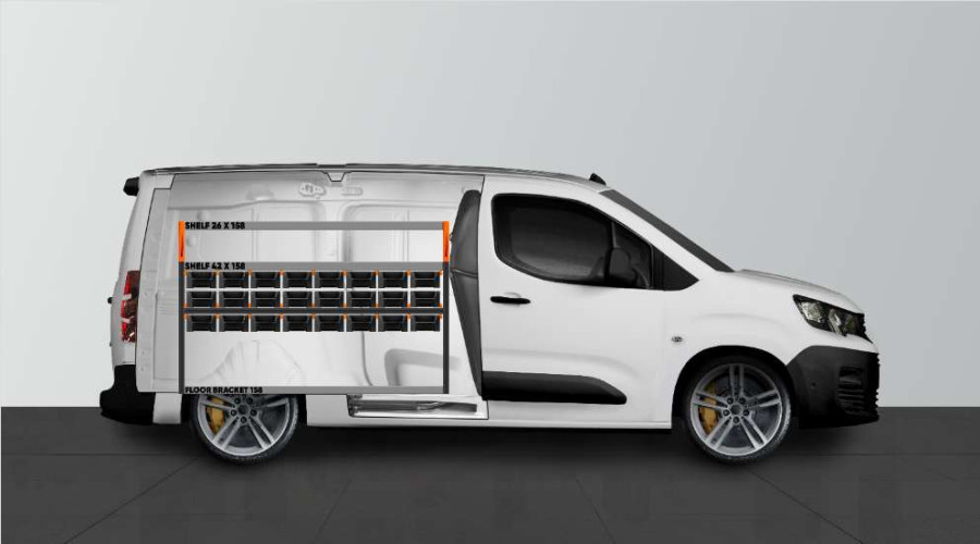 RACK ist eine neue, branchenführende Fahrzeugeinrichtung für den Citroën Berlingo, Opel Combo, Fiat Doblo Toyota Proace City & Peugeot Partner L2. Sie eignet sich perfekt für alle, die eine gute Aufbewahrungsmöglichkeit für ihr Sortiment benötigen, z. B. Schrauben, Kupplungen, Bolzen, Bohrer usw. Die Einrichtung wurde um insgesamt 15 unserer neuen unterteilbaren Modulboxen erweitert. Die Modulboxen werden auf fest montierten Schienen herausgezogen, was einen einfachen Zugang ermöglicht. Die Front der Modulboxen ist so konzipiert, dass sie optimale Zugänglichkeit bietet. Die Kästen können durch ein transparentes Fenster und Querzwischenwände ergänzt werden, die alle 60 mm eingeschoben werden können.