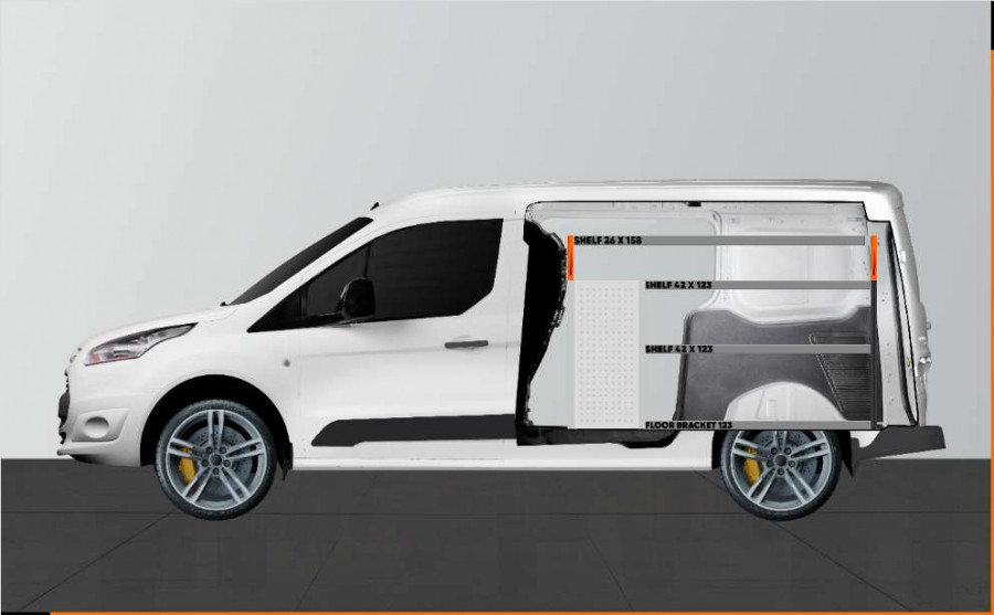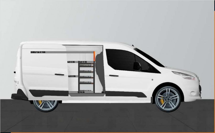 Dies ist eines der beliebtesten Systeme für den Ford Connect L2 mit Seitentür auf der Seite der Einrichtung. Die Einrichtung bietet gute Aufbewahrungsmöglichkeiten für Werkzeugtaschen/-koffer, Maschinen und Kleinteile. Sie umfasst eine Schubladeneinheit mit 5 Schubladen in verschiedenen Größen, damit jeder Ausrüstungsgegenstand seinen Platz erhält. Hinter den Schubladen befindet sich eine Werkzeugtafel, die zusätzliche Aufhängungsmöglichkeiten im Fahrzeug bietet. Die Schubladen auf Kugellagerschienen werden häufig durch unsere neuen Schubladeneinsätze und Trennwände ergänzt, um maximale Ordnung und Übersichtlichkeit zu gewährleisten. Die Regalwand wird gerne auch durch unsere Smartboxen ergänzt, um den Stauraum zu maximieren.