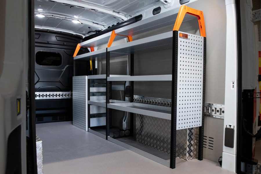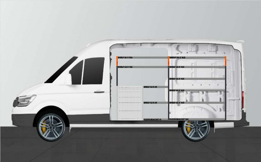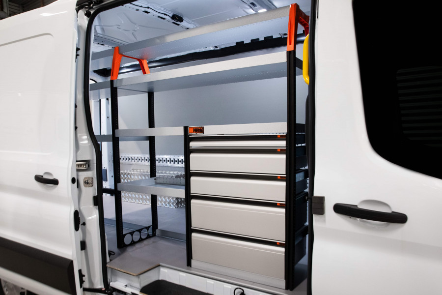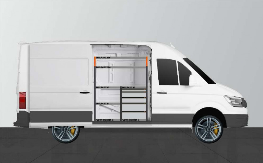 Dies ist eines der beliebtesten Systeme für den MAN TGE & Volkswagen Crafter L3 mit Seitentür auf der Seite der Einrichtung. Die Einrichtung bietet gute Aufbewahrungsmöglichkeiten für Werkzeugtaschen/-koffer, Maschinen und Kleinteile. Sie umfasst eine Schubladeneinheit mit 5 Schubladen in verschiedenen Größen, damit jeder Ausrüstungsgegenstand seinen Platz erhält. Hinter den Schubladen befindet sich eine Werkzeugtafel, die zusätzliche Aufhängungsmöglichkeiten im Fahrzeug bietet. Die Schubladen auf Kugellagerschienen werden häufig durch unsere neuen Schubladeneinsätze und Trennwände ergänzt, um maximale Ordnung und Übersichtlichkeit zu gewährleisten. Die Regalwand wird gerne auch durch unsere Smartboxen ergänzt, um den Stauraum zu maximieren.