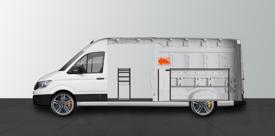 Fahrzeugeinrichtung mit Werkbank für MAN TGE & VW Crafter inkl. Schubladen zur Seitentür und Regalstaufläche. (Rücknahme/Umtausch ausgeschlossen)