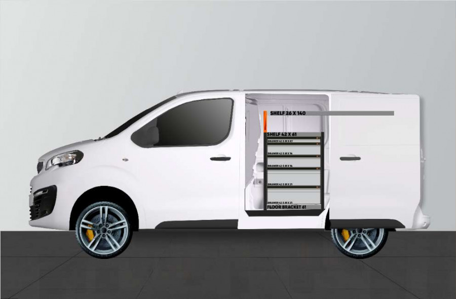 Dies ist eines der beliebtesten Systeme für den Peugeot Expert, Citroen Jumpy, Opel Vivaro, Fiat Scudo & Toyota ProAce mit Seitentür auf der Seite der Einrichtung. Die Einrichtung bietet gute Aufbewahrungsmöglichkeiten für Werkzeugtaschen/-koffer, Maschinen und Kleinteile. Sie umfasst eine Schubladeneinheit mit 5x Schubladen in verschiedenen Größen, damit jeder Ausrüstungsgegenstand seinen Platz erhält. Hinter den Schubladen befindet sich eine Werkzeugtafel, die zusätzliche Aufhängungsmöglichkeiten im Fahrzeug bietet. Die Schubladen auf Kugellagerschienen werden häufig durch unsere neuen Schubladeneinsätze und Trennwände ergänzt, um maximale Ordnung und Übersichtlichkeit zu gewährleisten. Die Regalwand wird gerne auch durch unsere Smartboxen ergänzt, um den Stauraum zu maximieren.