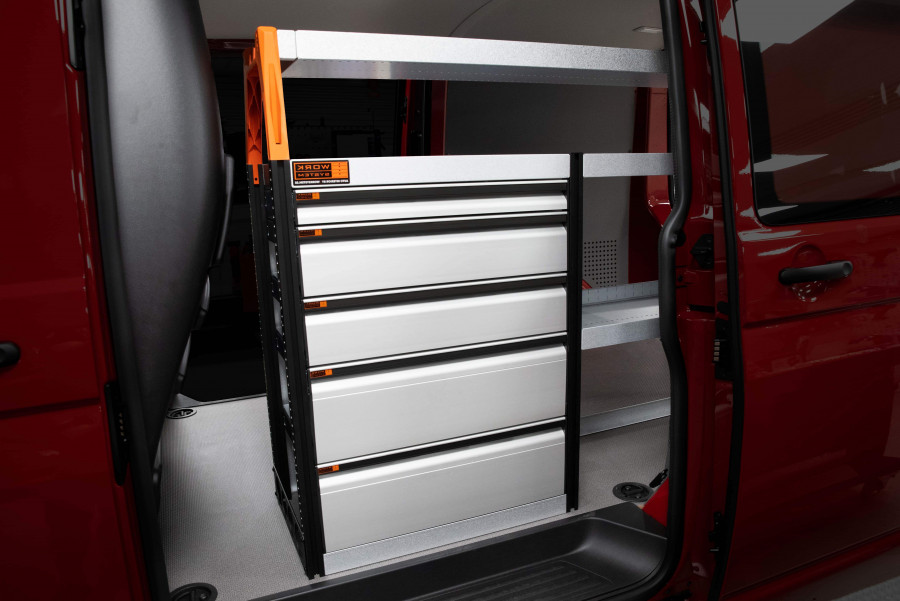 Mit der Serie Work System V-LS3 bieten wir Ihnen ein Fahrzeugregal für den Ford Custom L1, bestehend aus einem Regal mit drei Schubladen, ausgestattet mit Kugellagerschienen.