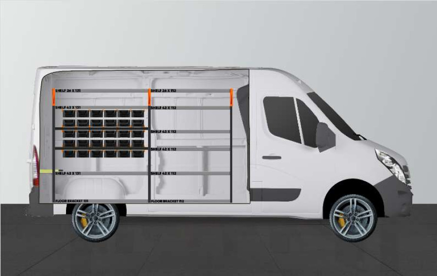 RACK ist eine neue, branchenführende Fahrzeugeinrichtung für den Opel Movano, Renault Master & Nissan NV400. Sie eignet sich perfekt für alle, die eine gute Aufbewahrungsmöglichkeit für ihr Sortiment benötigen, z. B. Schrauben, Kupplungen, Bolzen, Bohrer usw. Die Einrichtung wurde um insgesamt 30 unserer neuen unterteilbaren Modulboxen erweitert. Die Modulboxen werden auf fest montierten Schienen herausgezogen, was einen einfachen Zugang ermöglicht. Die Front der Modulboxen ist so konzipiert, dass sie optimale Zugänglichkeit bietet. Die Kästen können durch ein transparentes Fenster und Querzwischenwände ergänzt werden, die alle 60 mm eingeschoben werden können.