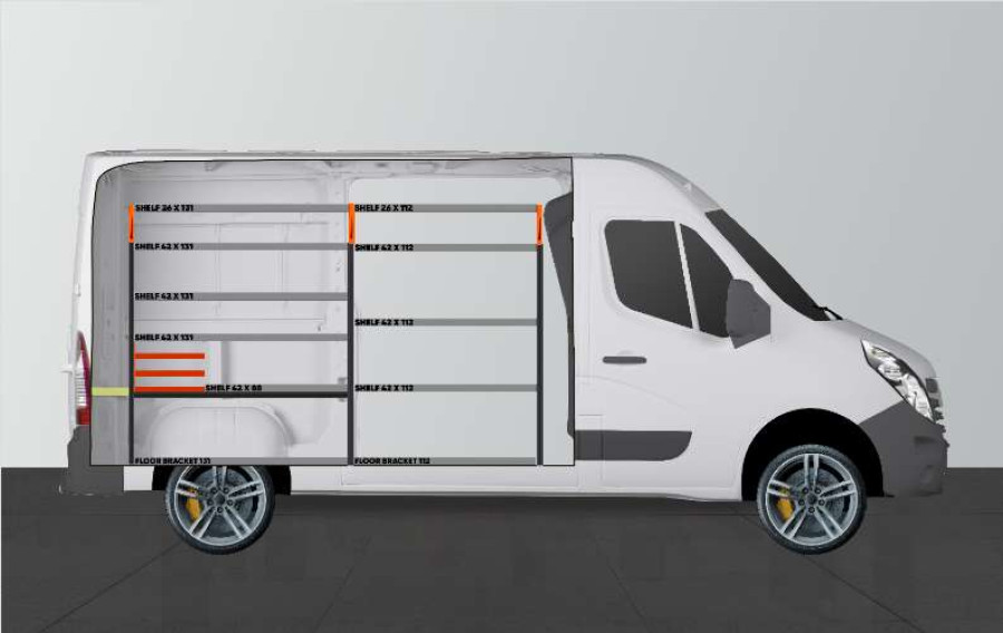 Eine beliebte Einrichtung für alle, die gute Aufbewahrungsmöglichkeiten für ihr Kleinteilsortiment sowie Werkzeugtaschen/-koffer und Maschinen benötigen. Diese Serviceeinrichtung enthält drei Sortimentskastenhalterungen, die an einen der beliebtesten Sortimentskästen auf dem Markt angepasst sind: Racco Carrylight. Die Einrichtung kann auf Wunsch um diese Sortimentskästen ergänzt werden. Die Fahrzeugeinrichtung passt perfekt zu Ihrem Opel Movano, Renualt Master & Nissan NV400.