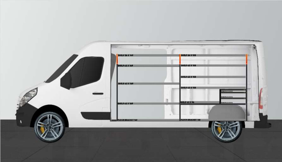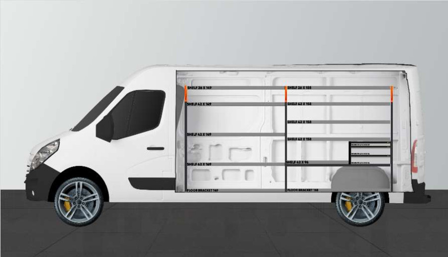 Dies ist eine unserer beliebtesten Fahrzeugeinrichtungen für den Opel Movano, Renault Master & Nissan NV400 L3. LS3 – Die Einrichtung wird u. a. von Hausmeistern, Servicetechnikern, Elektrikern, Heizungs- und Sanitärinstallateuren und Tischlern genutzt. Die Einrichtung bietet gute Aufbewahrungsmöglichkeiten für Werkzeugtaschen/-koffer, Maschinen, Verbrauchsmaterialien und Ihr Kleinteilsortiment. Die Schubladen werden oft durch unsere Schubladeneinsätze und Trennwände ergänzt. An den Regalwänden lässt sich durch unsere Smartboxen zusätzliche Staufläche gewinnen.