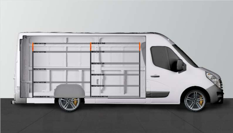 Eine Fahrzeugeinrichtung für Ihren Opel Movano, Renault Master & Nissan NV400, die gute Aufbewahrungsmöglichkeiten für Werkzeugtaschen/-koffer, Maschinen und Kleinteile bietet. Die Regalböden der Einrichtung haben eine Tiefe von 420 mm, dank derer sich die meisten auf dem Markt erhältlichen Werkzeugtaschen/-koffer problemlos verstauen lassen. Das obere Regal mit 262,5 mm wird oft durch unsere Modulboxen ergänzt, um Platz für die Aufbewahrung von Kleinteilen zu schaffen. Vergessen Sie nicht, die Werkzeugtafel der Regalwand zu nutzen.