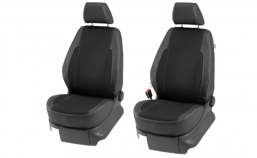 Sitzbezug für Caddy zwei Sitzplätze, vorn 1+1 inkl. Kopfstützen Komfortsitze, Aussparung für Lordosenstütze, Knopf an der Seite der Kopfstützen, keine Aussparung für Tisch auf der Rückseite (bis 2020)